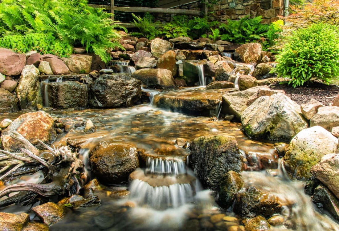 Flowing water adds motion and sound throughout the landscape. Streams can connect ponds, accent slopes, or become a focal feature on their own.